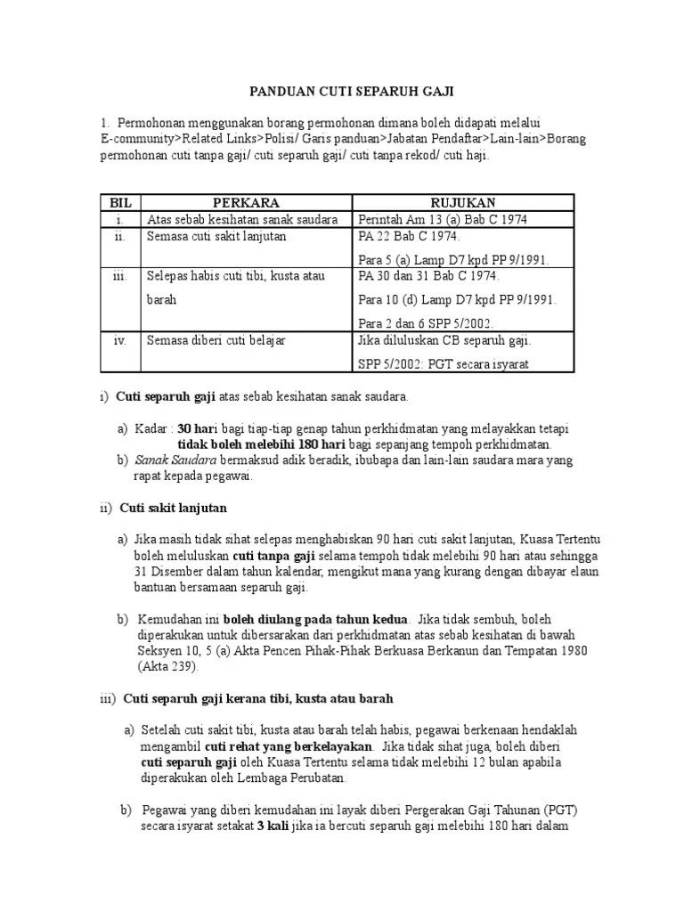 Dalam hal ini, kerajaan telah bersetuju untuk menaikkan kadar kelayakan. Semasa penggal sekolah, guru hendaklah: Jika tidak mencukupi, cuti bersalin separuh gaji hingga 14 hari digunakan; Cuti sakit tibi, kusta dan barah dan cuti belajar. Contoh simulasi kelayakan cuti bagi pegawai dalam keadaan di perenggan 14 adalah seperti di lampiran a. Menggunakan semua baki cuti bersalin bergaji penuh; Dan surat jpa.saraan(s)63/51/8 jld.2 (11) bertarikh 17 februari 2015. Jika masih tidak mencukupi, cuti bersalin tanpa gaji digunakan.